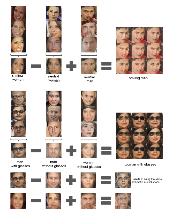 -> 아마도? 3개의 image의 z vector들을 평균내서 generator에 넣어서 나온 애(vector Y)들을 -> vector계산을 또해서 또 generator에 넣어서 women with glasses가 나온게 아닐까..?