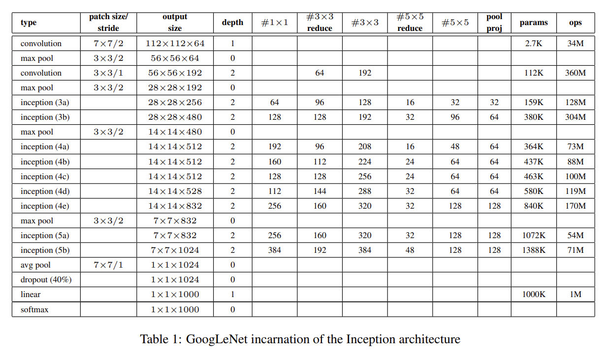 One can see the number of 1×1 filters in the projection layer after the built-in max-pooling in the pool proj column.