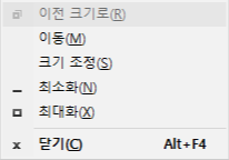 (만약 ALT+스페이스바 를 눌렀는데 해당창이 뜨지 않는다면, ALT+스페이스바를 누른뒤 바로 X키를 눌러주시면 됩니다.)